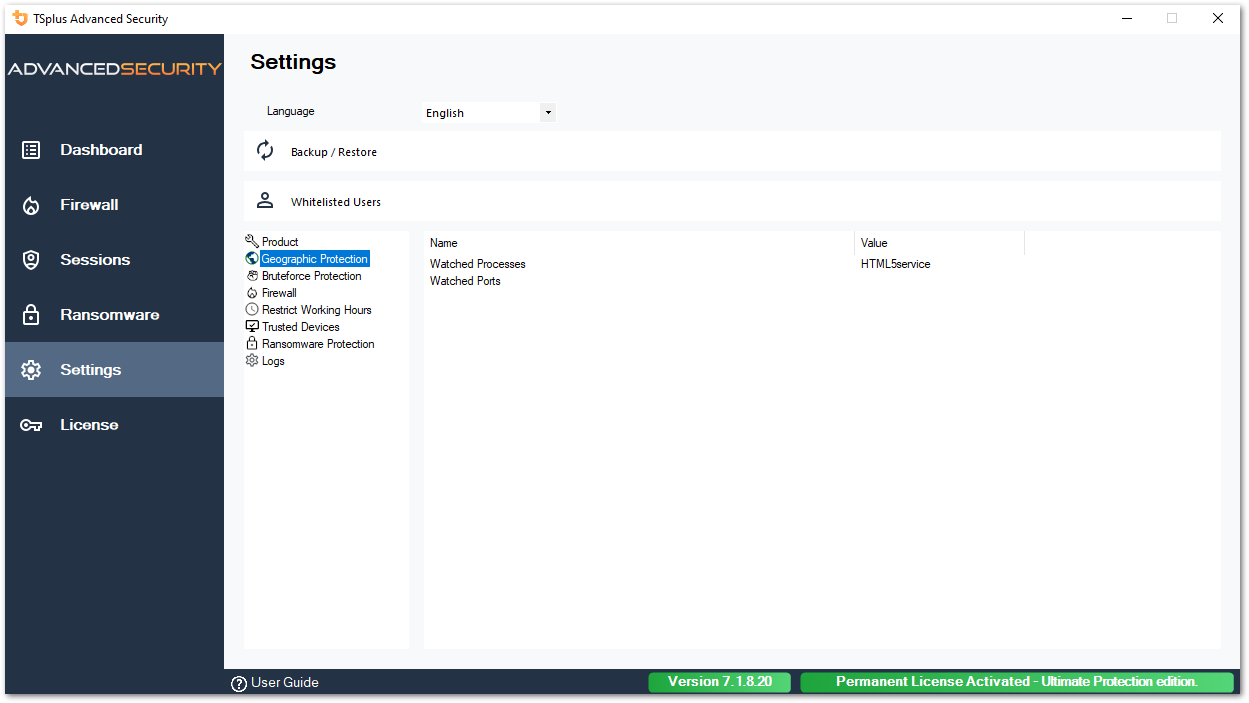 Easily configure the maximum logon attempts by IP address. In addition, Bruteforce Protection displays the current status of the Advanced Security service, Windows Firewall, Windows Logon Audit and HTML5 web portal logs.